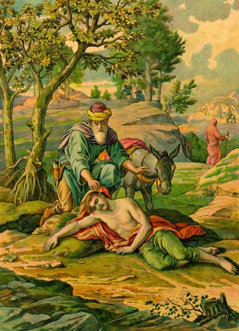 And, by chance, there came down a certain priest that way, and when he saw him, he passed by on the other side. And likewise a Levite, when he was at the place, came and looked on him, and passed by on the other side. But a certain Samaritan, as he journeyed, came where he was, and when he saw him, he had compassion on him, and went to him, and bound up his wounds, pouring in oil, and wine, and set him on his own beast and brought him to an inn, and took care of him. And on the morrow when he departed he took out two pence, and gave them to the host, and said unto him: Take care of him, and whatsoever thou spendest more, when I come again, I will repay thee. Which now of these three thinkest thou was neighbor unto him that fell among thieves? And he [the lawyer] said: He that showed mercy on him. Then said Jesus unto him, Go and do thou likewise!”