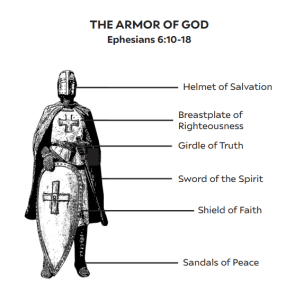Nor does he leave his soldiers unprotected but gives them a full panoply of armor: “Finally, my brethren, be strong in the Lord, and in the power of his might. Put on the whole armour of God, that ye may be able to stand against the wiles of the devil. For we wrestle not against flesh and blood, but against principalities, against powers, against the rulers of the darkness of this world, against spiritual wickedness in high places. Wherefore take unto you the whole armour of God, that ye may be able to withstand in the evil day, and having done all, to stand. Stand therefore, having your loins girt about with truth, and having on the breastplate of righteousness; And your feet shod with the preparation of the gospel of peace; Above all, taking the shield of faith, wherewith ye shall be able to quench all the fiery darts of the wicked. And take the helmet of salvation, and the sword of the Spirit, which is the word of God: Praying always with all prayer and supplication in the Spirit, and watching thereunto with all perseverance and supplication for all saints” (Ephesians 6:10-18).