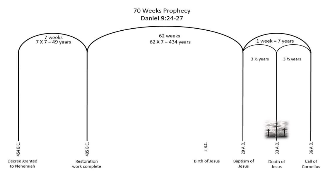 Daniel 9:25 states that the 70 weeks prophecy would be comprised of  various periods extending to “Messiah the Prince.” Examine the chart below and see how those time periods were fulfilled. Verse 25 states that the prophecy’s fulfillment would begin “from the going forth of the commandment to restore and to build Jerusalem.” Keep in mind that one week (7 days) represents seven years.