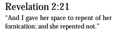“Space” here is the Greek word for a time.” The same expression is used in 12:14 where three-and-a-half “times” are mentioned — the same 1,260 years as in 11:3 and in Daniel 12:7. So, “space” or “time” is one year symbolically which equals 360 years literally. Adding 360 years to the beginning of Thyatira (which began in 1161 with the ministry of Peter Waldo) brings us to 1521. This is the date of Luther’s condemnation by the Diet of Worms. “Fornication” is, of course, the mixture of church and state which makes Babylon a harlot.