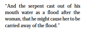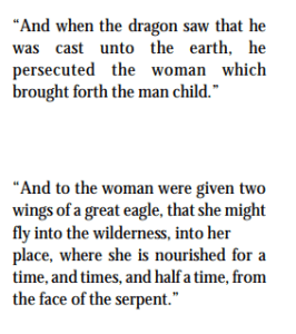 v. 14 The Dark Ages (3-½ symbolic years) were pictured by the 3-½ Year period in the life of Elijah when there was no rain. (Water is a symbol of truth. See also Amos 8:11.) The true church was fed during this time by the two wings (Old and New Testament writings) of a great eagle. (The eagle is far-sighted and represents WISDOM. This wisdom, of course, is the Bible itself which sustained true Christians all during the 1,260 years of Papal persecution.) Notice that the woman is hidden from “the face of the serpent.” A face is a symbol of favor. She was OUT OF FAVOR with the civil authorities. (Serpent and dragon are the same character as is shown by comparing verses 15 and 16.)