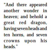 became the official symbol of pagan Rome, replacing the symbol of the eagle. This dragon is the civil power, known as pagan Rome, on its way out of power. Paul refers to it in 2 Thessalonians 2:7 as “he who now letteth.” The New American Standard reads, “…he who now restrains will do so until he is taken out of the way.” In short: Pagan Rome fought the development of Christianity (false as well as true); but pagan Rome was to disintegrate, making way, as Paul points out, for the “mystery of iniquity” — the “tare” class which would dominate Christianity and make Babylon such an anti-Christian institution even though it would claim the name of Christ. This dragon has seven heads (forms of government) and 10 horns (supporting powers). The antichrist was eventually to dominate these 10 powers. Thus we see in 11:13 that a tenth part (France) falls in the French Revolution. The crowns upon the heads show Rome’s sovereignty during its seven stages.
