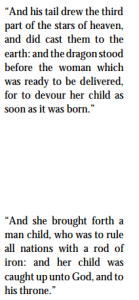 v. 5 The child of the covenant (Which was supposed to be true Christianity) turns out to be a “man child” — “the man of sin” which, during the Christian age, would rule all nations with total authority (a rod of iron). This is the clear history of the Roman Church during what most scholars call the Dark Ages. This “child” (the Papacy) was exalted to being “God on Earth.” (Compare 2 Thessalonians 2:3, 4.)