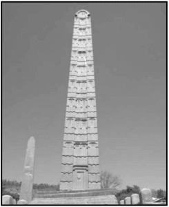 Under the reign of King Ezana (AD 330-356) ancient Black Aksum became the first major empire to convert to Christianity. In the early 4th century AD, Ezana spread his realm north and east, conquering the Nile Valley kingdom of Meroë, becoming ruler over part of both Asia and Africa. As a result of Ezana’s expansions, Aksum bordered the Roman province of Egypt. He constructed much of the monumental architecture of Aksum, including the reported 100 stone obelisks, the tallest of which loomed 98 feet over the cemetery in which it stood and weighed 517 tons.