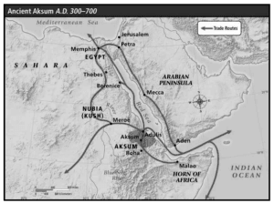Access to sea trade on the Mediterranean Sea and Indian Ocean helped Aksum become an international trading power. Traders from Egypt, Arabia, Persia, India, and the Roman Empire crowded Aksum’s chief seaport, Adulis. Look at the map and follow the trade routes.
