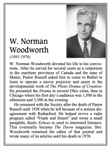 Norman Woodworth, with John Dawson, created the first radio program for the Society in 1927. It was in the form of a dialog between “Frank [Fact Finder] and Earnest [Truth Seeker].” After airing a number of programs featuring the truths taught by Pastor Russell, “Judge” Rutherford informed Woodworth that henceforth Rutherford would write the scripts and Woodworth would deliver them. When Woodworth objected to that approach, he was summarily evicted from the Watch Tower Bethel Home.