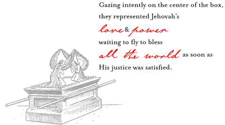 In this Holy of Holies, there was but one piece of furniture—the Ark of the Covenant. It was a rectangular gold-plated box. Its lid, called the Mercy Seat, was pure gold and represented God’s justice. On the Day of Atonement the blood of the bullock was sprinkled “upon and before” the Mercy Seat, in the shape of a cross, . This was a lovely picture of atonement, as only the blood of Christ can satisfy God’s justice. As part of the same gold that made the Mercy Seat, two golden cherubim were formed. Gazing intently on the center of the box, they represented Jehovah’s love and power, waiting for justice to be satisfied before they fly to bless THE WORLD .