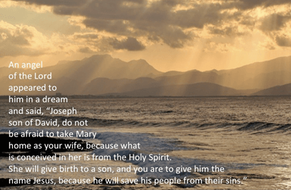 and said, “Joseph son of David, do not be afraid to take Mary home as your wife, because what is conceived in her is from the Holy Spirit. She will give birth to a son, and you are to give him the name Jesus, because he will save his people from their sins.” All this took place to fulfill what the Lord had said through the prophet: “The virgin will conceive and give birth to a son, and they will call him Emmanuel”(which means “God with us”).