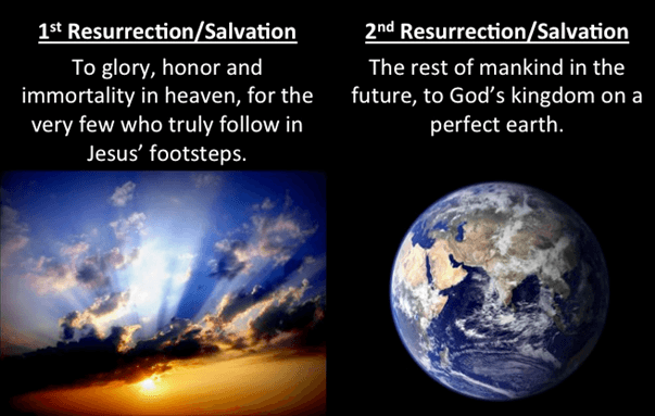 This means that there are actually two resurrections, and therefore, two salvations – the first resurrection, happening now, to a salvation of glory, honor and immortality in heaven, for the very few who truly follow in Jesus’ footsteps. Secondly, there is also a resurrection of the rest of mankind, as we have already seen, in the future, to God’s kingdom on a perfect earth.
