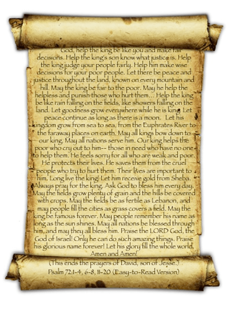 Like Joseph and Joshua, the parting words of David reveal what was on his heart. The chapter is titled “A Psalm for Solomon.” David’s last prayer, his last song, his parting words, were for his son Solomon. But why Solomon—why not his other sons? Well, Solomon was special. God had chosen him to succeed David as king of Israel. He was to be a symbol of our Lord’s kingdom reign. And David knew that Solomon would be faced with extraordinary challenges, as he took over the kingship of Israel.