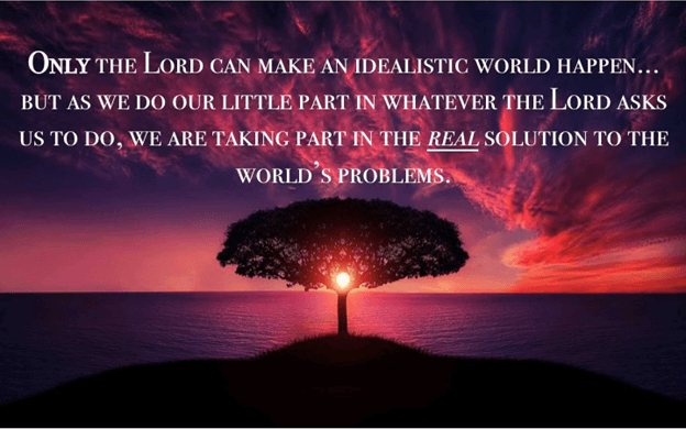 But, as David indicated, only the Lord can make it happen. And so, remember, as we do our little part today in whatever the Lord asks us to do, we are taking part in the real solution for the world’s problems. We are working for the ideals described in this chapter. David’s words remind us of all that. We can be part of the solution.
