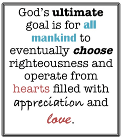 Of course He could have done just that. If so, we would have been spared the past 6,000 years of sin and its resulting devastation. However, we would have operated robotically. Our lives would lack the element that would bring us the deepest happiness! God’s choice was to create intelligent creatures in His own image with the sake of accomplishing His ultimate goal. This goal is for all mankind to eventually choose righteousness and operate from hearts filled with appreciation and love, not to do these things because they are robots who have been programmed.