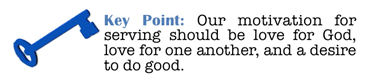 Matthew 20:28, “The Son of man came not to be served, but to serve, and give his life a ransom for many.” He came to serve and told us to follow him. He suggests that a true Christian’s goal should be to ask what he can give; how he can serve. Having the right motivation is crucial. Jesus shows us what that is.